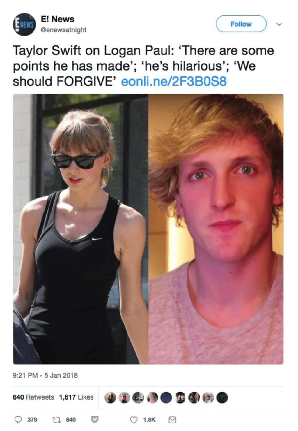 This is a tweet that looks like it is from the E! celebrity news site. The specific tweet seems to imply that Taylor Swift is saying that people should forgive Logan Paul for an inappropriate video he show in Japan in January 2018.