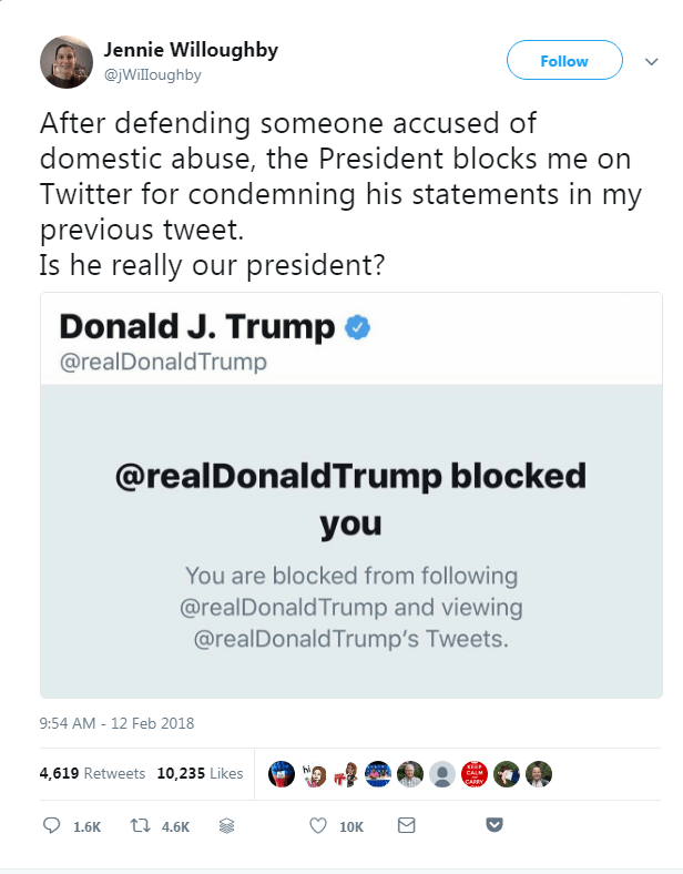 This tweet claims to be by Jennie Willoughby, a former wife of Rob Porter. Porter, a senior Trump administration official who recently resigned, and is accused of physically assaulting Willoughby during their marriage.