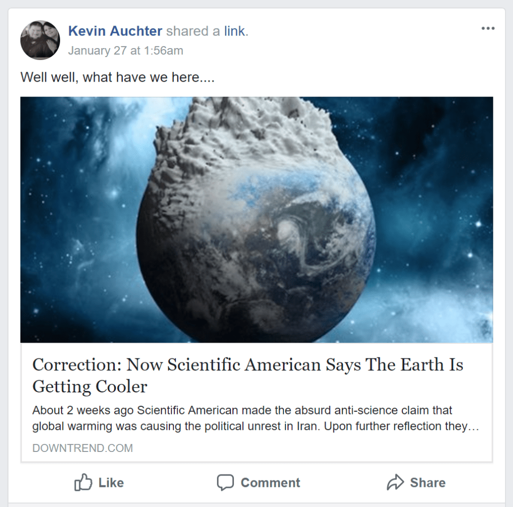 Does Scientific American say that the earth is getting cooler? This Facebook linked article says so: