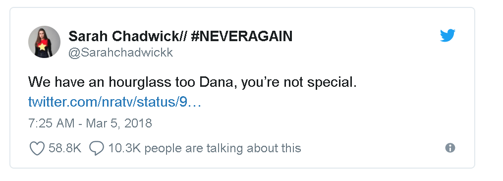 Is this tweet from a Parkland shooting survivor, or a fake account looking for clicks? We have an hourglass too Dana, you’re not special. https://t.co/Ne8B1Ti2GL — Sarah Chadwick (@Sarahchadwickk) March 5, 2018