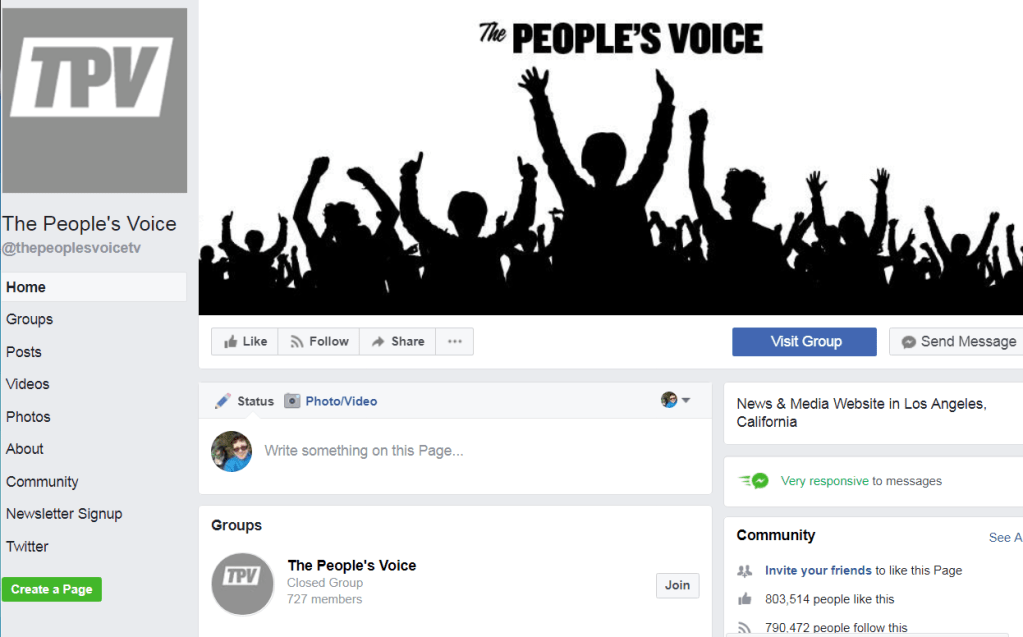 Take a look at this Facebook group. (“The People’s Voice” at facebook.com/thepeoplesvoicetv/). What can 90 seconds of research tell you about them of interest?